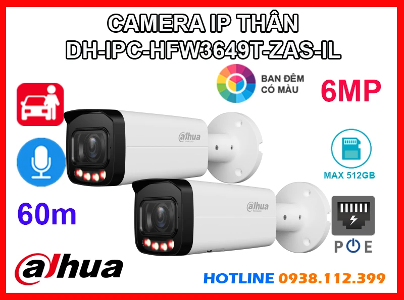 DH-IPC-HFW3649T-ZAS-IL là camera thân ngoài trời tích hợp công nghệ WizSense mang đến giải pháp an ninh thông minh và hiệu quả. Với độ phân giải 6MP siêu nét đèn kép hỗ trợ hình ảnh màu ban đêm, tầm nhìn hồng ngoại 60m, cùng micro ghi âm và khả năng nhận diện chính xác người và xe, camera đảm bảo giám sát chuẩn xác 24/7 hỗ trợ POE, khe thẻ nhớ lên đến 512GB và chuẩn chống nước IP67