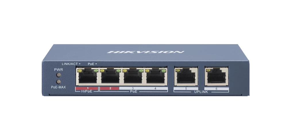 🥇 Switch DS-3E1106P-EI/M hỗ trợ tối đa 6 cổng Ethernet với 4 cổng PoE và 2 cổng RJ45.